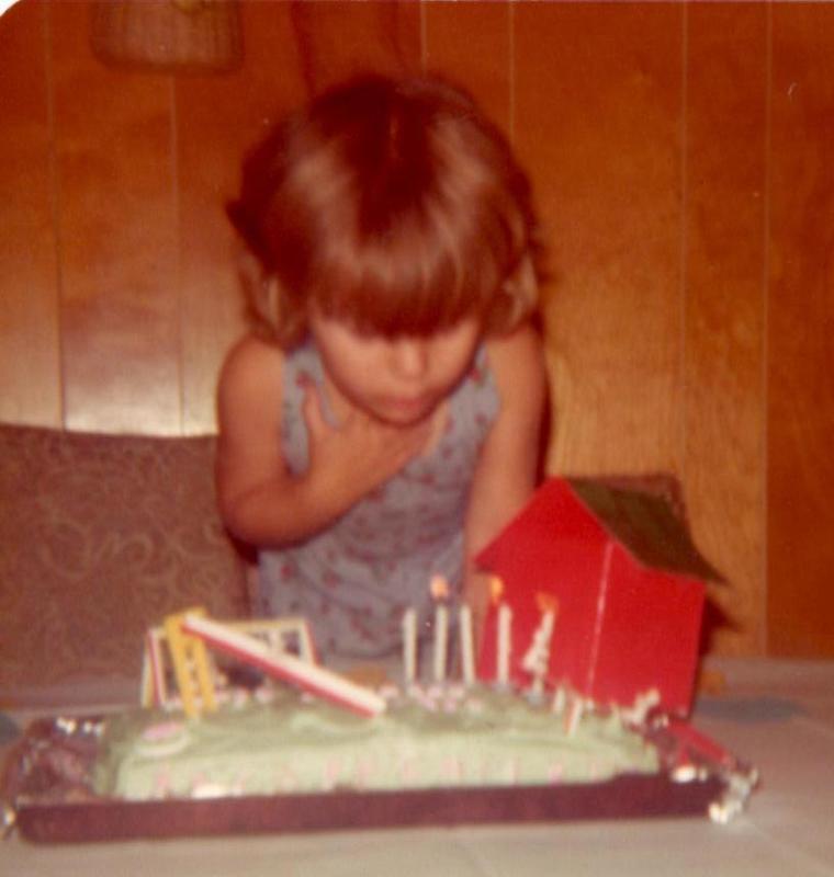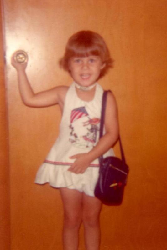 "I am always excited for the first day of school! When I was getting ready to enter kindergarten, I was so excited about getting to go to school that my Mom made me a cake for my birthday (which is at the end of July) with "my school" and the playground on it. I can still remember walking into the kitchen and seeing it for the first time! The other photo shows me on my first day of kindergarten in an outfit sewn and embroidered by my Mom. I was so happy! "