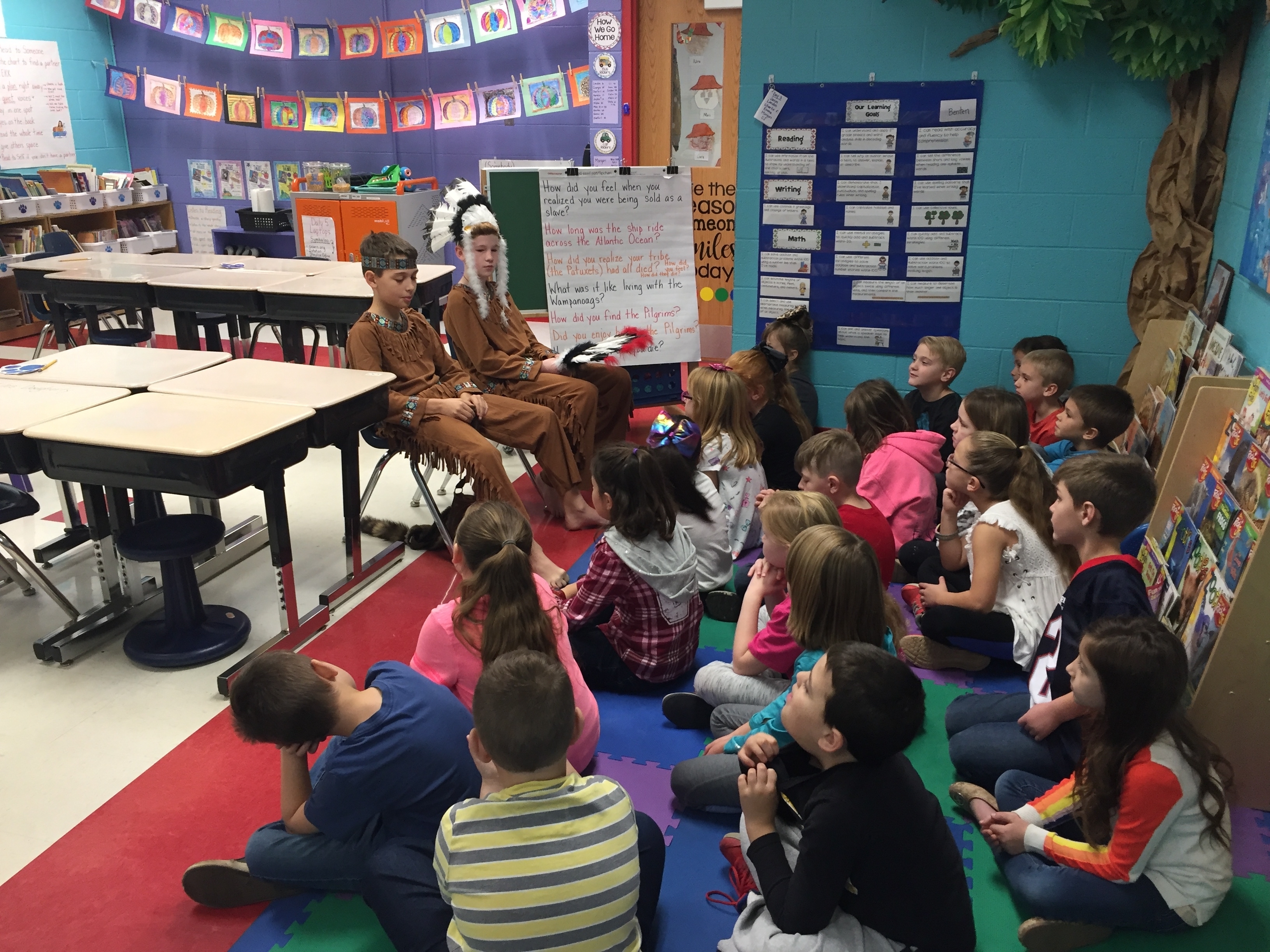 Young Native Americans Squanto (Quincy DeSherlia) and Samoset (Mason Green) visited the 2nd graders to talk about life in the 1620s. They answered questions and brought several artifacts like animal pelts, Chief Massasoit’s headdress, and real arrowheads. Second grade students have learned so much about the lives of Native Americans and Pilgrims over the past two weeks! This was such a fun culmination!