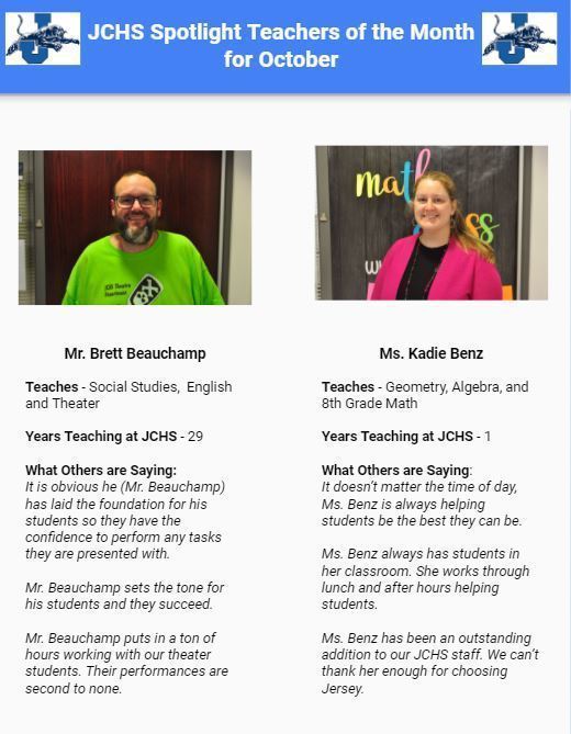 JCHS October Spotlight Teachers of the Month