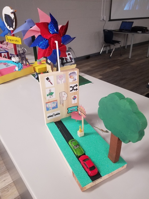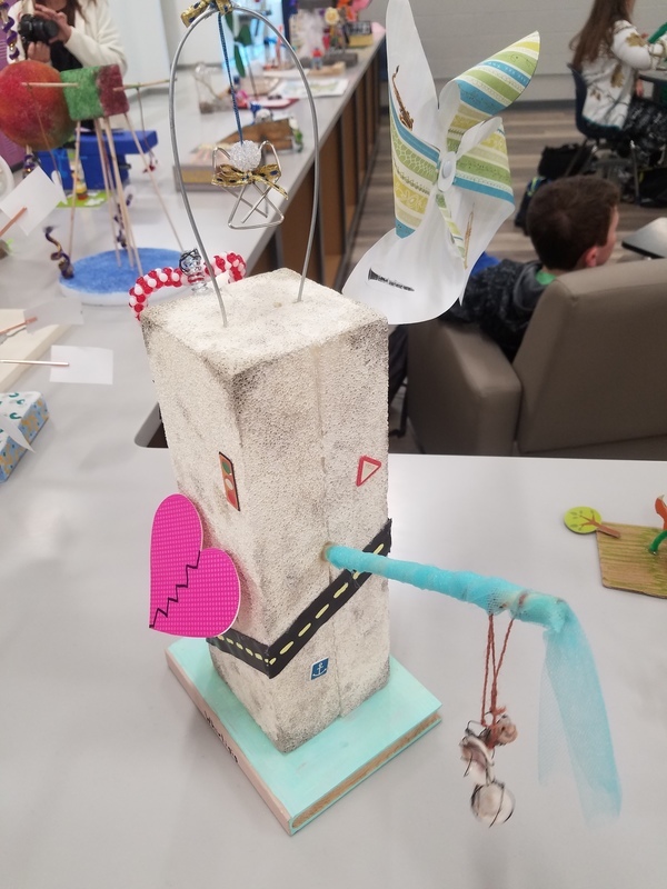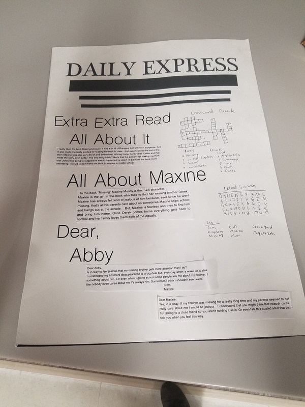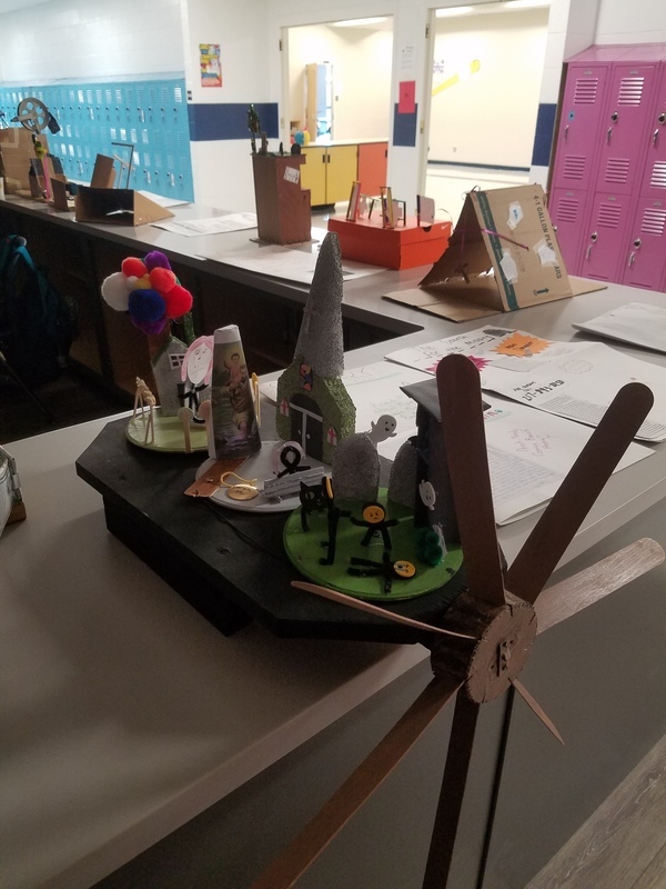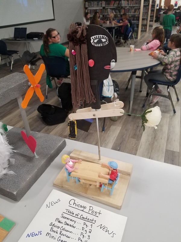 JCMS 7th Grade Students in Mrs. Goetten's Literature and Honors Literature classes completed projects after reading their first quarter novels. The working whirligigs displayed symbols representing important story elements such as theme, important scenes, characters, etc. The newspapers included articles which featured important story elements from the novels as well. The students presented these projects to the class and displayed them for faculty and students in the newly remodeled IMC.