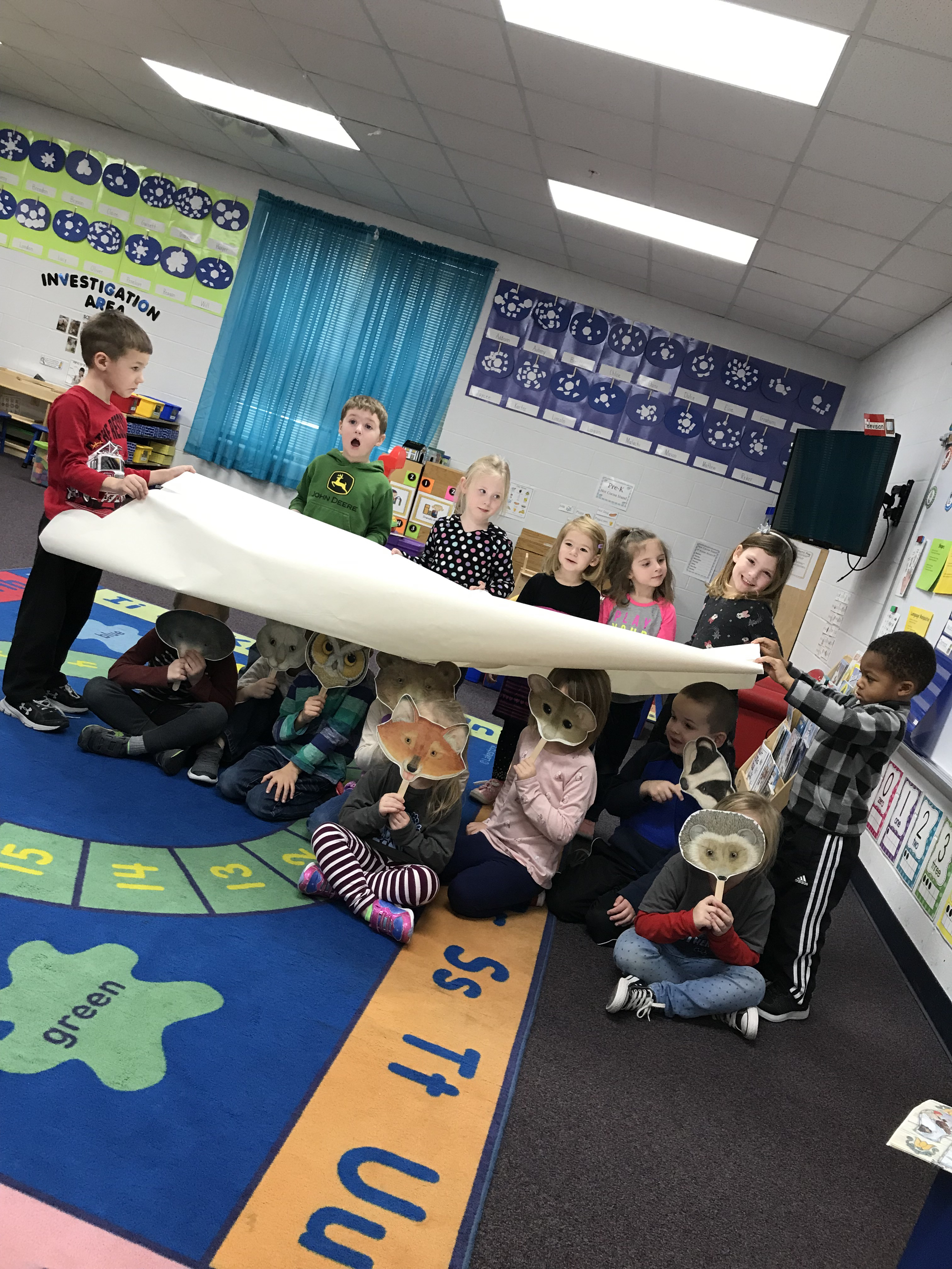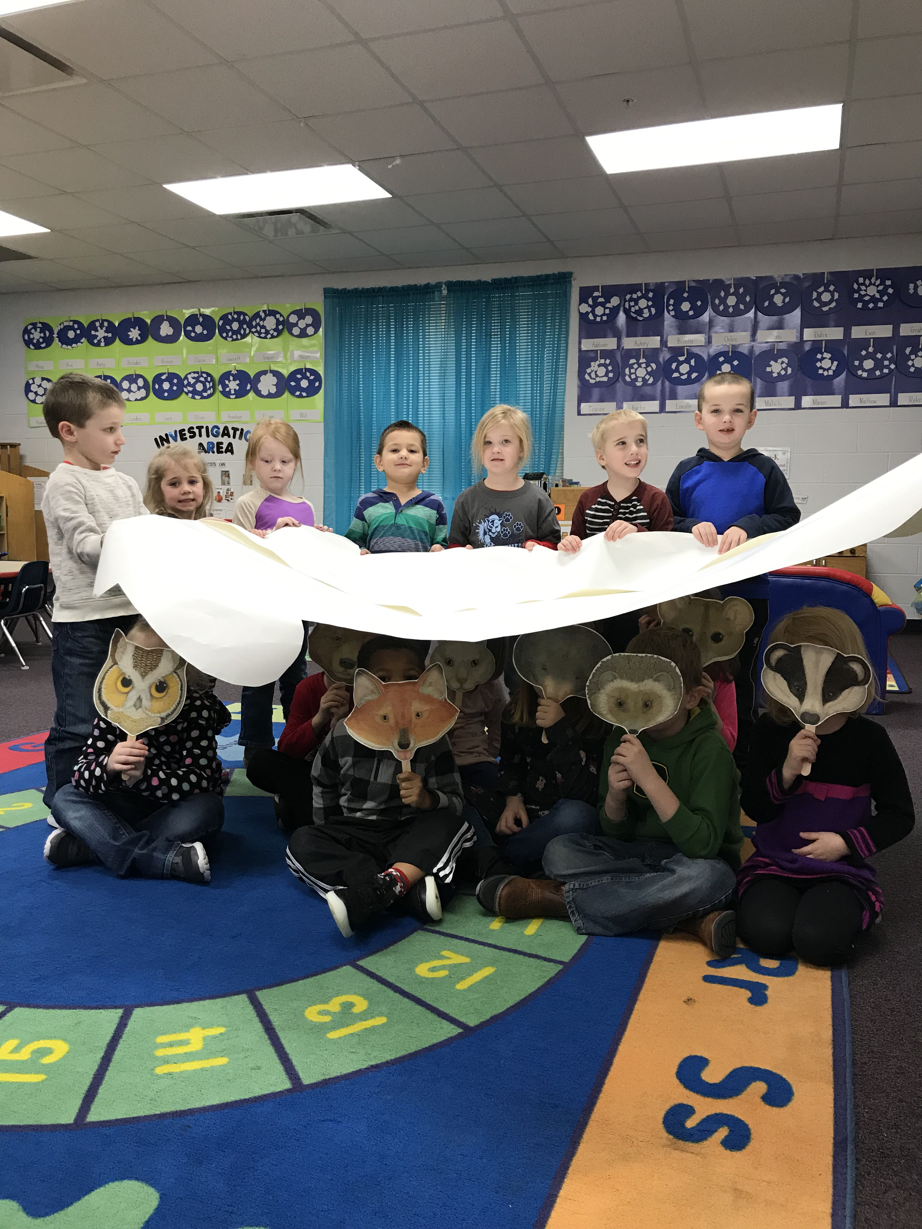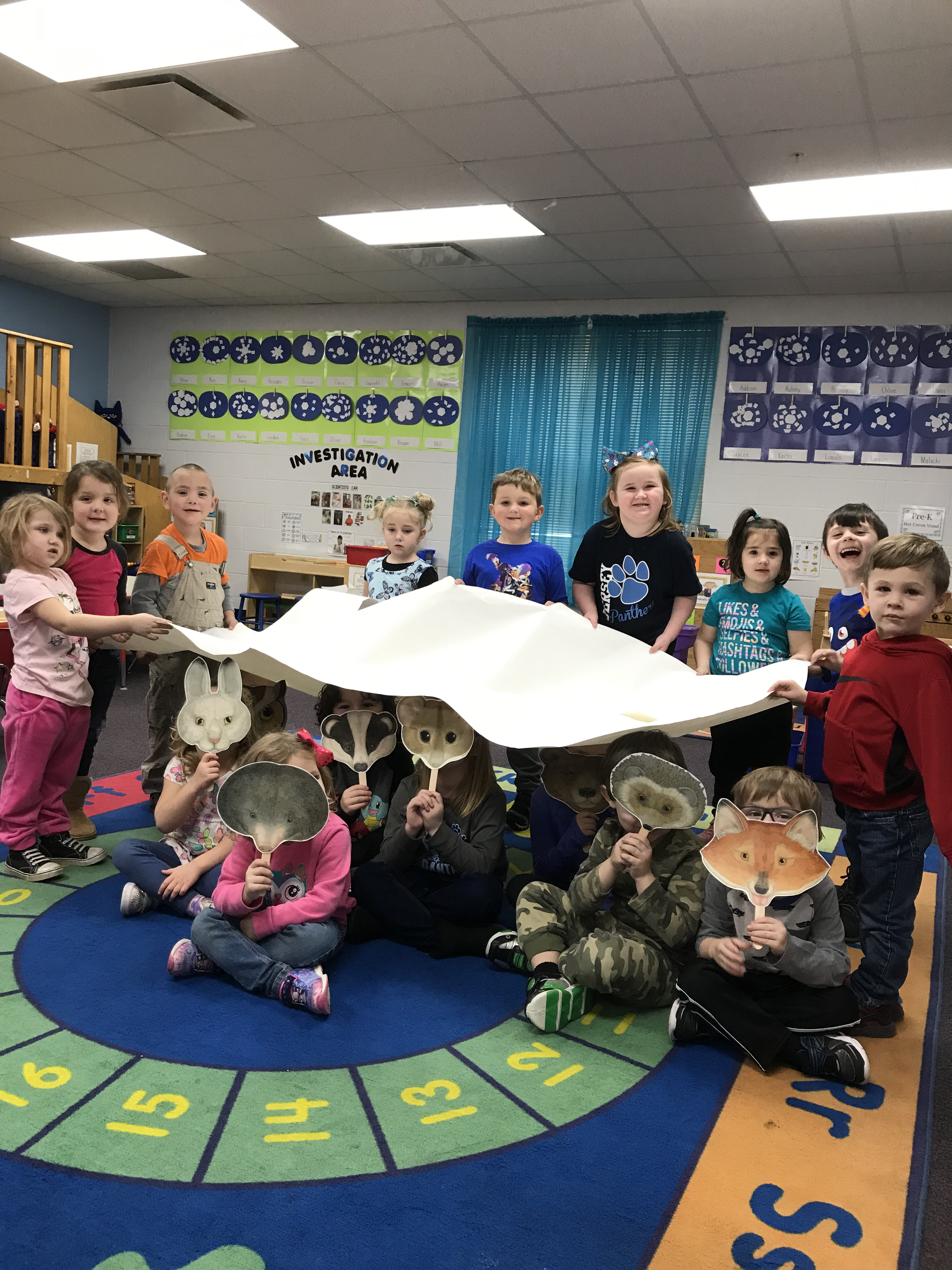 Mrs. Herman’s a.m. and p.m. pre-K classes acted out the book The Mitten by Jan Brett. Using face puppets and a very large mitten all the animals were safe underneath!