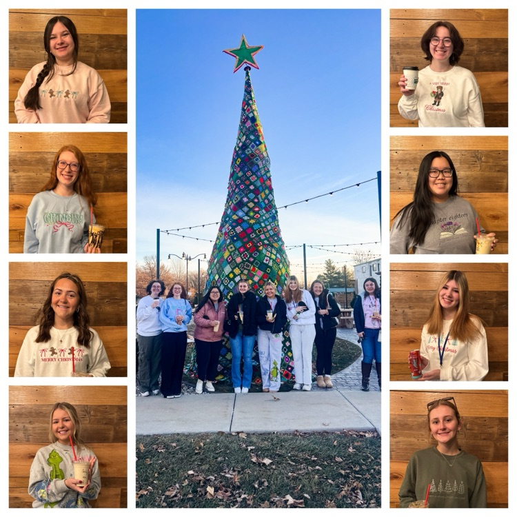JCHS Advanced Design wrapped up the semester with a coffee treat then posed in front of the community granny square tree they worked so hard on. They are each wearing self-made embroidered holiday sweatshirts. đź«¶