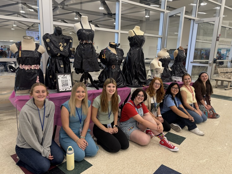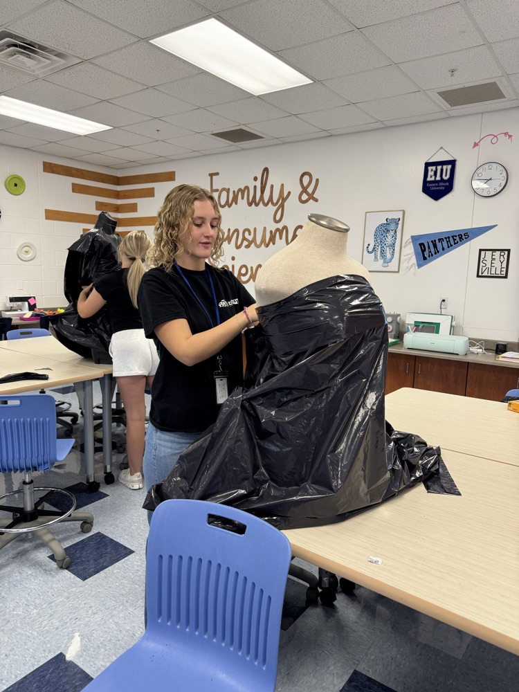 Advanced Design students participated in a Trash Bag Dress Challenge. Students were supplied with a mannequin and could only use the supplied trash bag, repurposed materials, pins, needle and thread, and clear tape. Students had 80 minutes to complete the challenge.