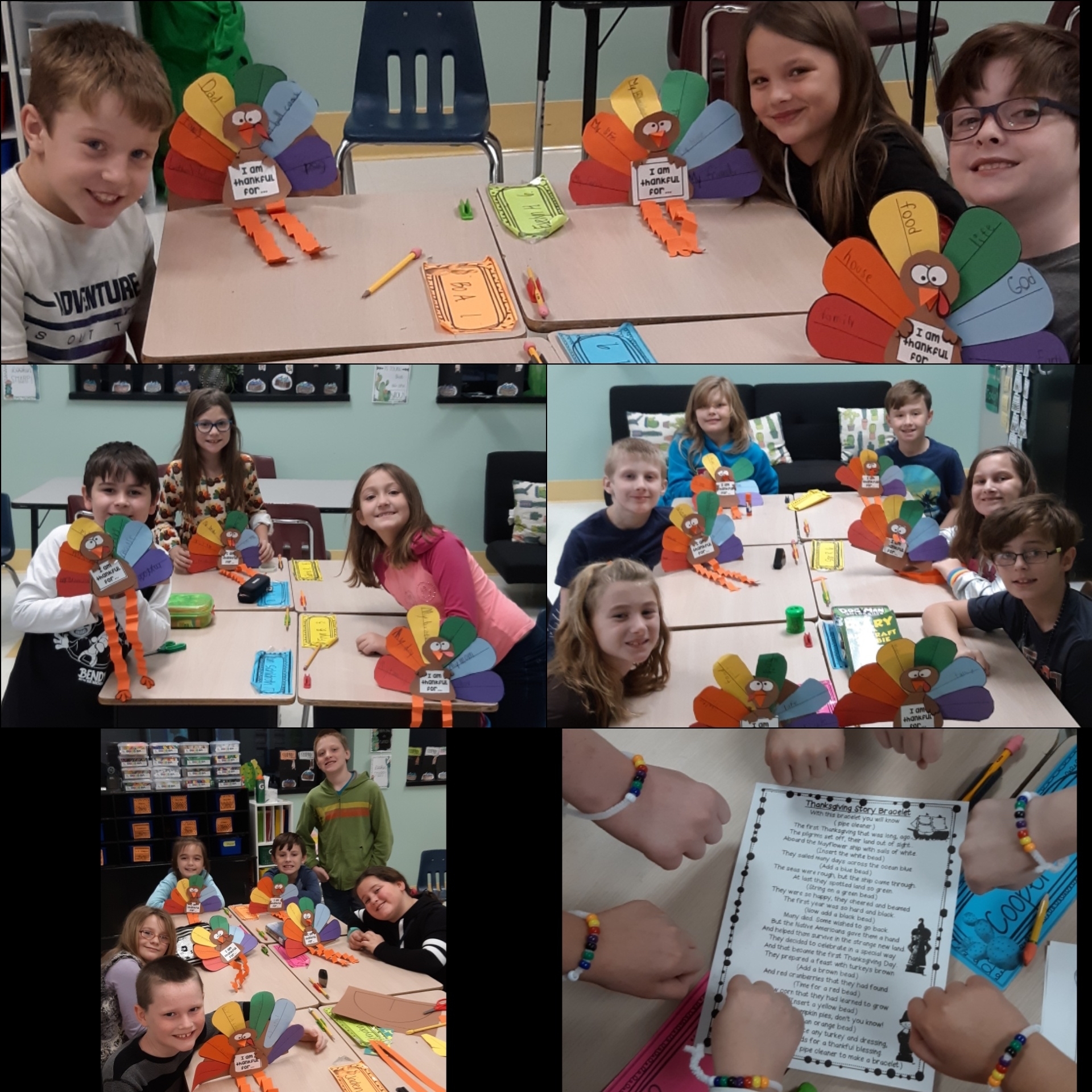 Third grade students in Mrs. E. Fry and Mrs. Jacobs' class had fun learning about Thanksgiving by making Thanksgiving Bracelets, Homemade Butter, Pumpkin Pie in a Bag, and Thankful Turkeys!